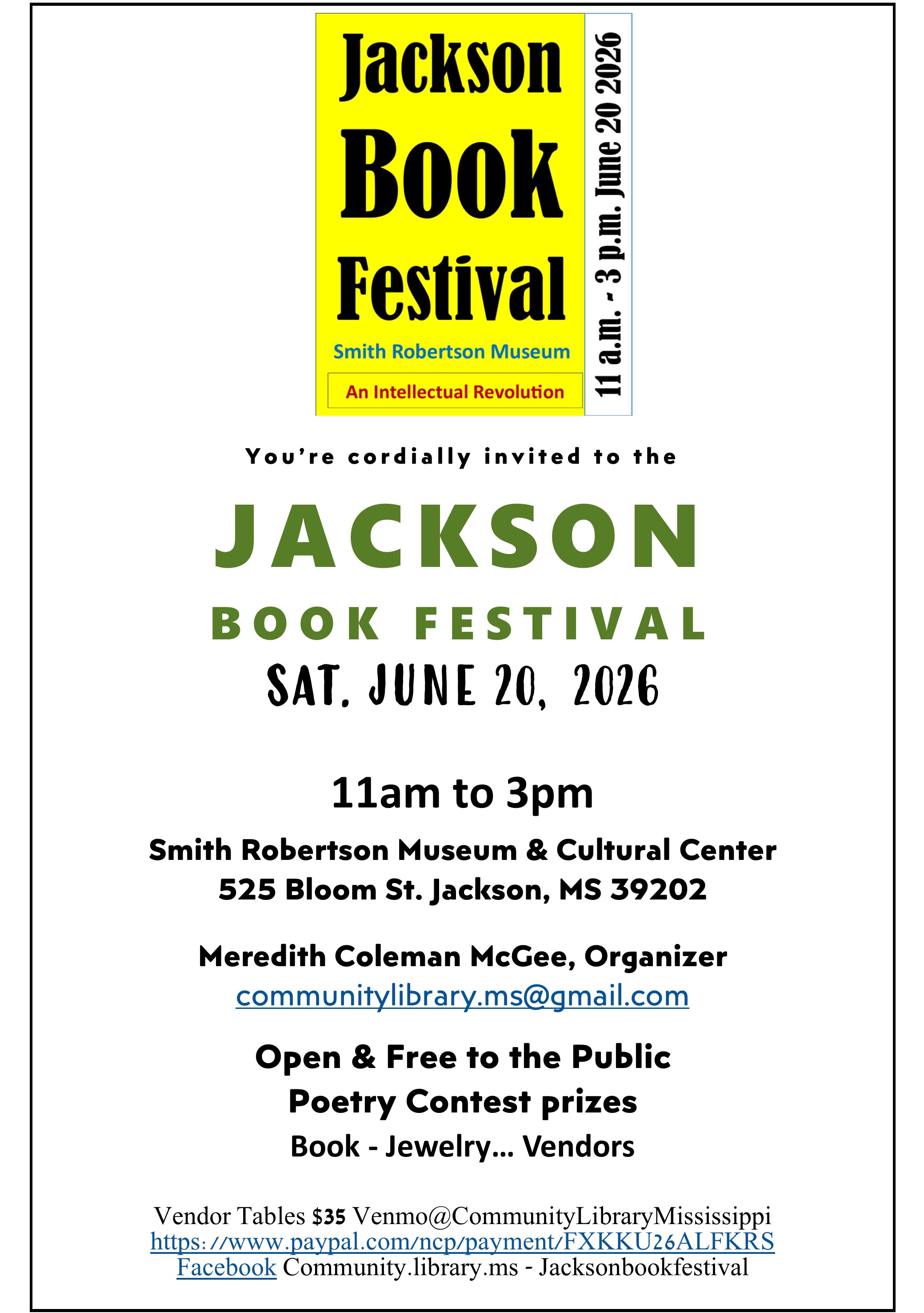 Jackson Book Festival 2026. Jackson, MS 06.20.2026 Standard March 29, 2026 Leave a comment Register on Eventbrite Tables $35 Venmo@CommunityLibraryMississippi https://www.paypal.com/ncp/payment/FXKKU26ALFKRS $35 Rate this:Share this: Share on X (Opens in new window) X Share on Facebook (Opens in new window) Facebook Like Loading... Related