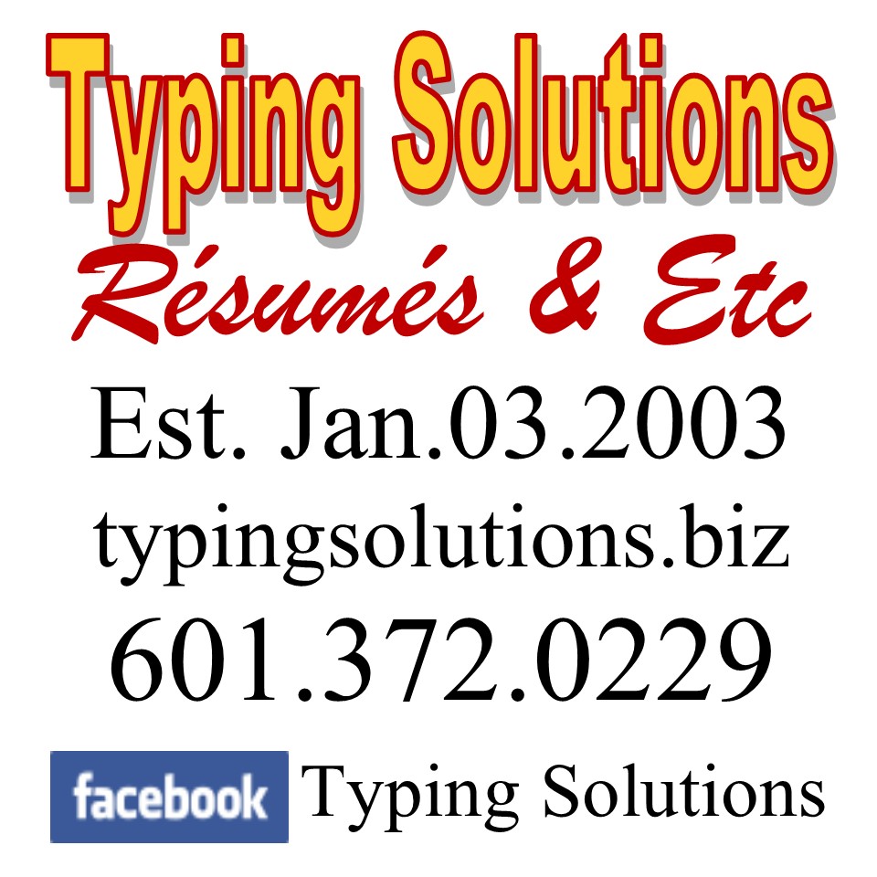 Typing Solutions Résumés & Etc has provided résumé, writing, typing, business consulting, and editorial services for 20 years. We started this day, January 3rd, in 2003.
